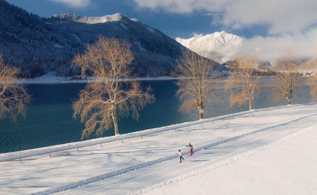 Direkt vor dem Atoll Achensee geht es los: Der Loipeneinstieg ist direkt über das winterlich verhüllte SEE-Bad erreichbar. Eine klassische wie auch eine Skating-Loipe ziehen in beide Richtungen ihre Runden und bieten Möglichkeiten für Anfänger wie auch für Konditionsstarke. Ausgerüstet mit wintertauglicher Sportbekleidung, bequemen Langlaufschuhen, Skiern und langen Stöcken, kann es auch schon los gehen. Wir starten Richtung Norden und genießen bei jedem Schritt die wunderbare Aussicht über den Achensee. Schritt für Schritt gleiten wir mit den schmalen Skiern in den geformten Spuren. Abwechselnd schieben wir die beiden Schier nach vorne und unterstützen mit den Armen gegengleich, um an Fahrt zu gewinnen. Da ist schon ganzer Körpereinsatz nötig, um bergauf wie auch bergab Haltung zu bewahren.