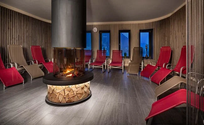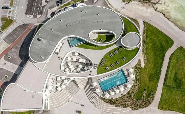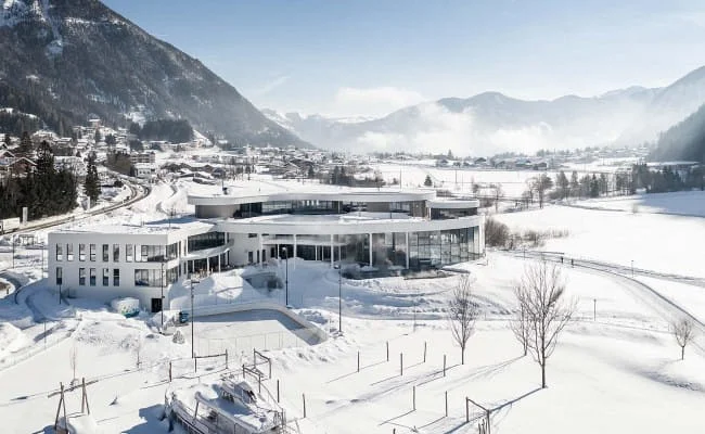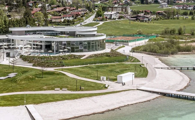 Auch das kristallklare Wasser des Achensees ist allgegenwärtig: Glas und helles Holz sind die bestimmenden Elemente der Anlage, die sich perfekt in die Uferlandschaft integriert. Auch in der Wasserwelt läuft alles „rund“: Kreisförmige Holzlamellen an der Decke erlauben im großzügigen Panorama-BAD atemberaubende Blicke auf den See, vermitteln aber auch Wohlbefinden und Behaglichkeit. Unvergleichlicher Höhepunkt für alle Entspannungs- und Sauna-Enthusiasten ist der Freiluft-Schwimmbereich auf dem Dach, der mit Tauchbecken und Infinity-Pool Berge und See zu einer Einheit verschmelzen lässt.