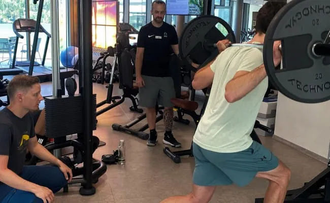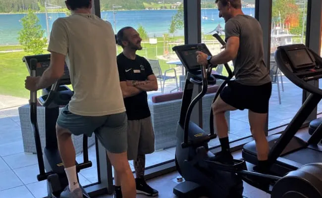 Wir bekommen heute hautnahen Einblick in den Ablauf einer solchen Therapie. Mit dabei: Hannes (Physiotherapie Lechner), Michael (Team Lakeside-GYM im Atoll Achensee) sowie die beiden ÖSV-Athleten und regelmäßig im Atoll Achensee trainierenden, Benjamin und Mario.