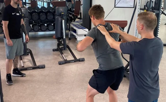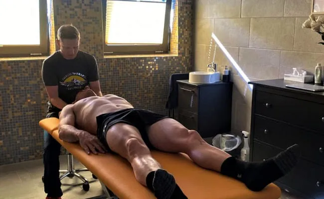 Nach erfolgter ärztlicher Verordnung der Therapiemaßnahmen startet das Team der Physiotherapie mit einem Anamnesegespräch und der Untersuchung, um die körperlichen Beschwerden und Defizite zu lokalisieren. In 7 bis 10 Einheiten können nun gezielt diese Schwachstellen behandelt werden. Die beiden Athleten kennen ihren Körper sehr gut und durch das regelmäßige Training wissen sie um die Wichtigkeit von Regeneration und Therapie. Doch auch bei den beiden Profis erkennt Hannes Verklemmungen im Bereich der Wirbelsäule, sowie muskuläre Dysbalancen, die sie erst die Therapieeinheit bewusster wahrnehmen lässt. Mit gezielten Handgriffen untersucht Hannes den Bewegungsapparat der beiden und wird bald fündig: eine Mischung aus Lockerung, Massage und gezieltem Druck gibt Abhilfe: Sichtlich befreit freut sich Mario über seine mobilisierte Wirbelsäule: „Das hat richtig gutgetan!“. „Oft schmerzt es den Patienten an ganz anderer Stelle als wo die vermeintliche Ursache liegt. Da sind einige Personen durchaus überrascht, wo sich der Ursprung ihres Schmerzes befindet. Mit der Therapie können wir eine Schmerzlinderung, Entlastung und Verbesserung der Beweglichkeit erreichen. Durch physiotherapeutische Trainingstherapie wird der Patient unter Rücksichtnahme auf die Wundheilungsphasen Step by Step an die alltägliche Belastung herangeführt. Ebenso wichtig ist anschließend ein nachhaltiges und regelmäßiges Training und oft auch eine Umstellung der täglichen Gewohnheiten“, so Hannes Lechner. Michael ergänzt: „Genau hier liegt die Stärke der Zusammenarbeit von Physiotherapeuten und Fitnesstrainern. Bereits in der Therapie werden Übungen an Geräten, auf der Matte, an der Boulderwand oder auch im Becken durch den Therapeuten integriert und durch den Patienten erlernt. Das Atoll Achensee bietet hier die optimale Infrastruktur. Wir als ausgebildete Trainer im Lakeside-GYM helfen den Patienten nach der Therapie eine Routine in ihrem Training zu entwickeln, Übungen gezielt anzupassen und Abwechslung in den (Trainings-)Alltag zu bringen.“