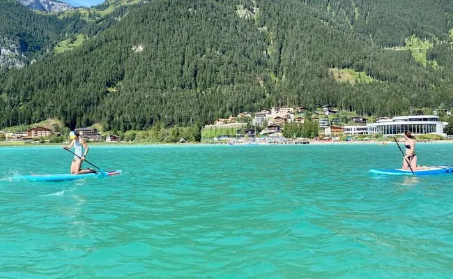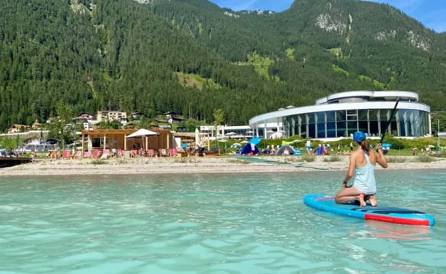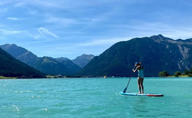 Also nichts wie ab auf das Board! In wenigen Momenten aufgepumpt, Finne adjustiert und ab AUFs Wasser. Der perfekte Einstieg gelingt uns an einem der 3 Stege im SEE-Bad des Atoll Achensee – dort kann elegant und ohne Bodenberührung gestartet werden. Für Anfänger empfiehlt sich der Sitzstart, um sich erstmal an den wackeligen Untergrund zu gewöhnen. Fortgeschrittene hingegeben prahlen mit einem souveränen Tritt aufs Board. Und schon geht’s los. Fantastisch wie sich der Blick auf das Wasser und das Ufer ändert: Je nach Tiefe des Wassers von türkisgrün bis dunkelblau. Die Schönheit der Natur ist hier allgegenwärtig. Am Südufer gestartet, paddeln wir Richtung Norden und peilen die Uferpromenade von Pertisau an. Noch ist das Wasser aalglatt und das Vorankommen gelingt leicht. Doch schon bald werden wir von den Wellen eines vorbeikommenden Schiffs gehörig ins Wanken gebracht und ehe man sich versieht, landet schon der erste Paddler im kühlen Nass des Achensees. Platschnass, aber unversehrt ist er geblieben. Schnell schwimmt er zurück ans SUP und kraxelt hoch. Unter dem Lachen der anderen geht’s weiter. Nach einer Stunde auf dem SUP spüren wir bereits die weichende Kraft im ganzen Körper. Zum SUPen gehört scheinbar neben einer guten Armtechnik vor allem ein gehöriges Maß an Körperspannung. So wird das Paddeln schnell zu einem Ganzkörpertraining. Wir nutzen den aufkommenden Nordwind, um kraftsparend zum Ausgangspunkt Atoll Achensee zurückzukommen. Wohlverdient ab in den Liegestuhl, Beine hoch und ein Erfrischungsgetränk zu Handen Backboard und ein Eis zu Handen Steuerboard 😉.