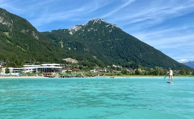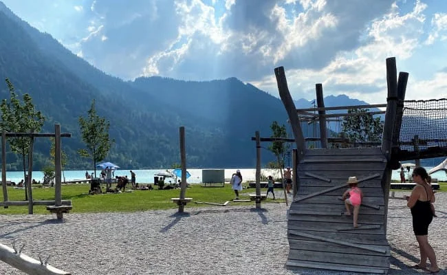 Mit fortschreitender Uhrzeit wird’s langsam warm. Da lockt der blitzblaue Achensee mit einer wohltuenden Abkühlung. Gesagt, getan! Ab ins kühle Nass! Der seichte Seezugang macht es Eva leicht, ins Wasser zu kommen. Sie rennt mit den sanften Wellen um die Wette und erkundet die Uferlandschaft. Gießkanne, Schaufel und Kübel dürfen dabei natürlich nicht fehlen. Derweilen haben es sich Eva’s Eltern in unmittelbarer Nähe auf der großzügigen Liegewiese bequem gemacht. Von hier aus lässt sich das sommerliche Treiben auf und um den See wunderbar beobachten: unzählige SUPs (Stand-Up-Paddles), Segelboote und Tretboote tummeln sich am See, größere Kinder treffen sich auf der blauen Liegeplattform am See, beim Tischtennis oder am Beachvolleyball-Platz. „Das fühlt sich wie Kurzurlaub an“, sind sich die beiden einig.