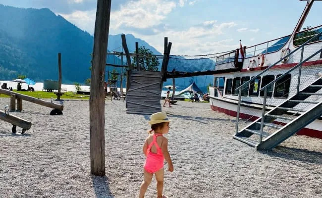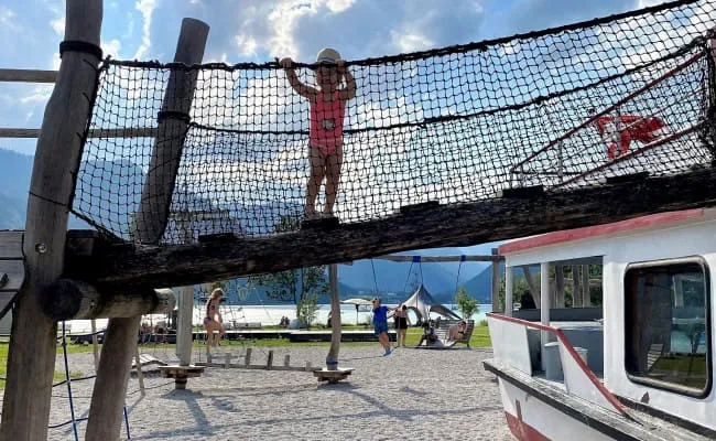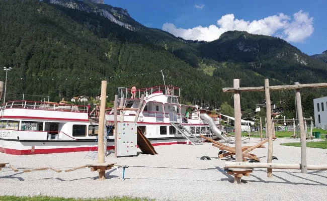 „Wow Mama, schau mal - ein Schiff!“, Evas Blick fällt sofort auf die altehrwürdige St. Benedikt - ein ausgedientes Schiff der Achensee-Flotte, welche umgebaut zu einem Kinder- und Motorikparadies, eine zweite Bestimmung gefunden hat. Fast fällt es ihr schwer, sich zu entscheiden welches Klettergerüst, welche Stiege oder Rutsche sie als erstes nehmen soll. Ganz hoch kommt sie hinauf bis zum ehemaligen Führerhaus des Kapitäns. Ganz schnell saust sie vorbei mit dem Flying Fox an der Seite des Schiffs. Und ganz hoch springt sie am Trampolin neben dem Schiff. Für manche Attraktionen braucht sie noch Hilfe von ihrer Mama, da tuen sich größere Kinder schon etwas leichter. Es ist einfach für Kinder jeder Altersgruppe etwas dabei!