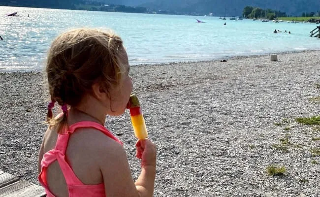 Und was gehört zu einem Urlaubstag dazu? Eva kennt die Antwort: ein EIS! Die BEACH-Bar direkt am See ist schnell erreicht und mit den Füßen im Sand schmeckts gleich doppelt so gut. Herrlich, dieser Blick auf die umliegenden Berge und den glasklaren Achensee! Eva treibt es schnell wieder ins Wasser - zu schön ist das Spielen mit den Steinen, das Wasserspritzen und das Abtauchen!