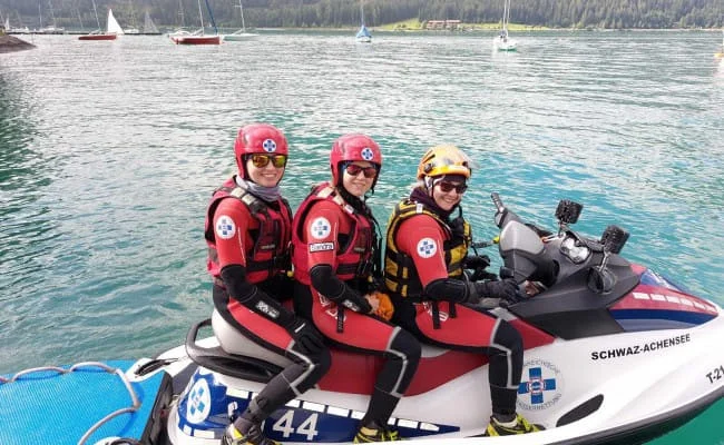Doch die Wasserrettung bietet noch vieles mehr – vielleicht habt ihr sie schon mal mit ihrem Motorboot über den Achensee oder dem Jetski am Inn fahren sehen, um in Not geratenen Personen zu helfen? Neben Lebensrettungen in Fließwasser, Binnengewässer und Wildwasser und den dazu gehörenden Erste-Hilfe-Leistungen, gehören auch Taucheinsätzen oder Bootsbergungen, oder Hochwassereinsätze zu ihrem Kernaufgabengebiet. „Am Achensee zählen zu den Haupteinsatzgebieten vor allem die Bergung von Verletzten vom Gaisalmsteig (wo ein Patientenabtransport oft nur vom Wasser aus möglich ist) oder die Rettung von gekenterten oder herrenlosen Schiffen und Wassersportgeräten. Besonders den charakteristischen und oft plötzlich aufziehenden Nordwind unterschätzen viele Seebenutzer“, so Markus Unterkofler vom Stützpunkt Achensee. In den Sommermonaten ist das Bootshaus an Wochenenden und Feiertagen sogar durchaus ehrenamtlich besetzt, um schnellstmöglich einsatzbereit zu sein. Auch bei zahlreichen Sportveranstaltungen wie Regatten oder auch dem Achenseelauf sind die ehrenamtlichen Lebensretter im Einsatz.