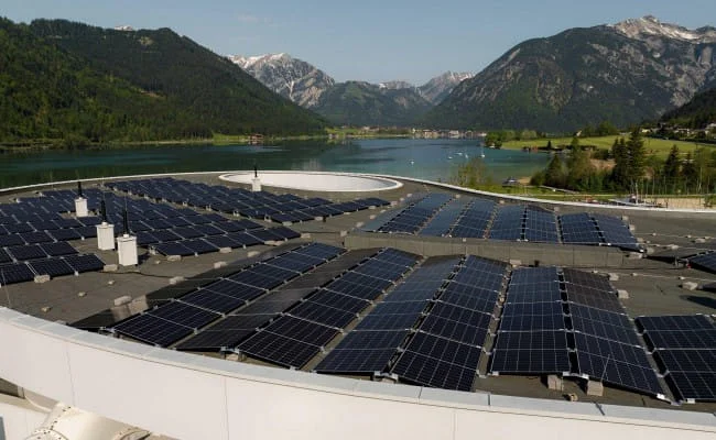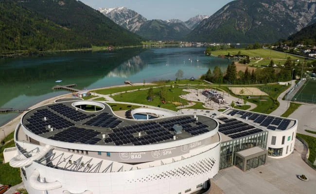 480 Hochleistungs – Solarpaneele schöpfen aus purer Sonnenkraft und erzeugen mit 196,8 kWp installierter Leistung rund 220.000 kWh. Das entspricht in etwa dem jährlichen Stromverbrauch von 40-50 Haushalten. Somit produziert das Atoll Achensee seinen eigenen Ökostrom – für umweltfreundliches Bade- und Saunavergnügen direkt am größten See Tirols. Installiert wurde die Photovoltaikanlage von der Firma IS&S Innovative Solutions & Services e.U., die hohe Lösungskompetenz bewies. Denn die tropfenförmige Architektur und das runde Dach des Atoll Achensee stellten eine besondere Herausforderung für das Verlegen der Solarpaneele dar.