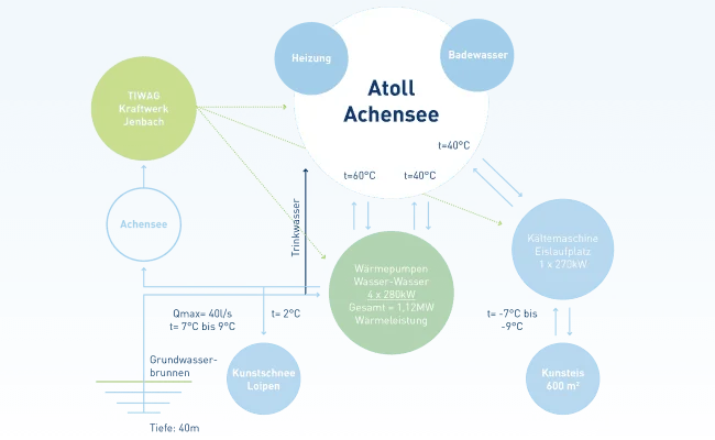 Das Atoll Achensee erzeugt seine Wärme für Wasser-, Filter- und Heizungsanlagen mittels 4 Grundwasserwärmepumpen und somit komplett CO2-frei. Doch auch die Abwärme der Kühlhäuser und des Eislaufplatzes werden zur Erwärmung des Wassers genutzt und sparen somit viel Energie.