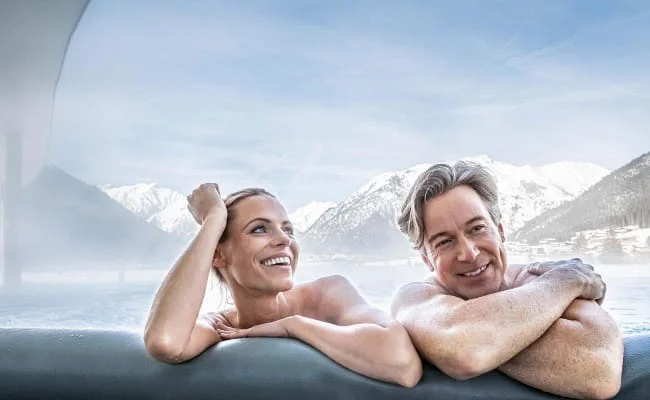 Vormittags noch auf der Piste, sehnen sich Körper und Geist nach Erholung und Regeneration. Nichts wie raus aus den Ski-Klamotten und rein in den kuscheligen Bademantel und die Bade-Schlappen. Zum Start auf in die „milderen“ der Panorama-Saunen: bei 60 Grad und Zirbenduft gewöhnen wir unseren Körper an das Saunieren. Bereits jetzt spüren wir wie uns die Anstrengungen des morgendlichen Skifahrens entschwinden. Nach 15 Minuten Schwitzzeit geht’s dann raus in die frische Luft – welch ein Erlebnis sich die nackten Beine im frischen Schnee zu vertreten und den „Kneipp-Effekt“ voll auszukosten. Die ganz Mutigen wagen sogar einen Nackapatzl-Schneeengel. Andere wagen sich nach einer kurzen Dusche in das – auch sehr erfrischende – Tauchbecken. Wir fühlen uns wie neu geboren, als wir es uns in unseren Bademänteln im Ruheraum mit Blick über den Achensee gemütlich machen. Eine Stunde später ist „Aufguss-Zeit“: Wir wagen uns in die finnische Aufgusssauna wo wir bei einem echten Achentaler Steinöl-Aufguss schwitzen dürfen. Die ätherischen Öle wirken sich zusätzlich positiv auf den Organismus und die Atemwege aus. Wir wiederholen das Ritual des „Schwitzens – Abkühlens – Erholens“ und genießen die wohltuenden Effekte auf unseren Körper. Hungrig füllen wir unsere Speicher im aussichtsreichen Bistro des Penthouse-SPAs auf – schließlich will der Körper auch kulinarisch mitnaschen 😉