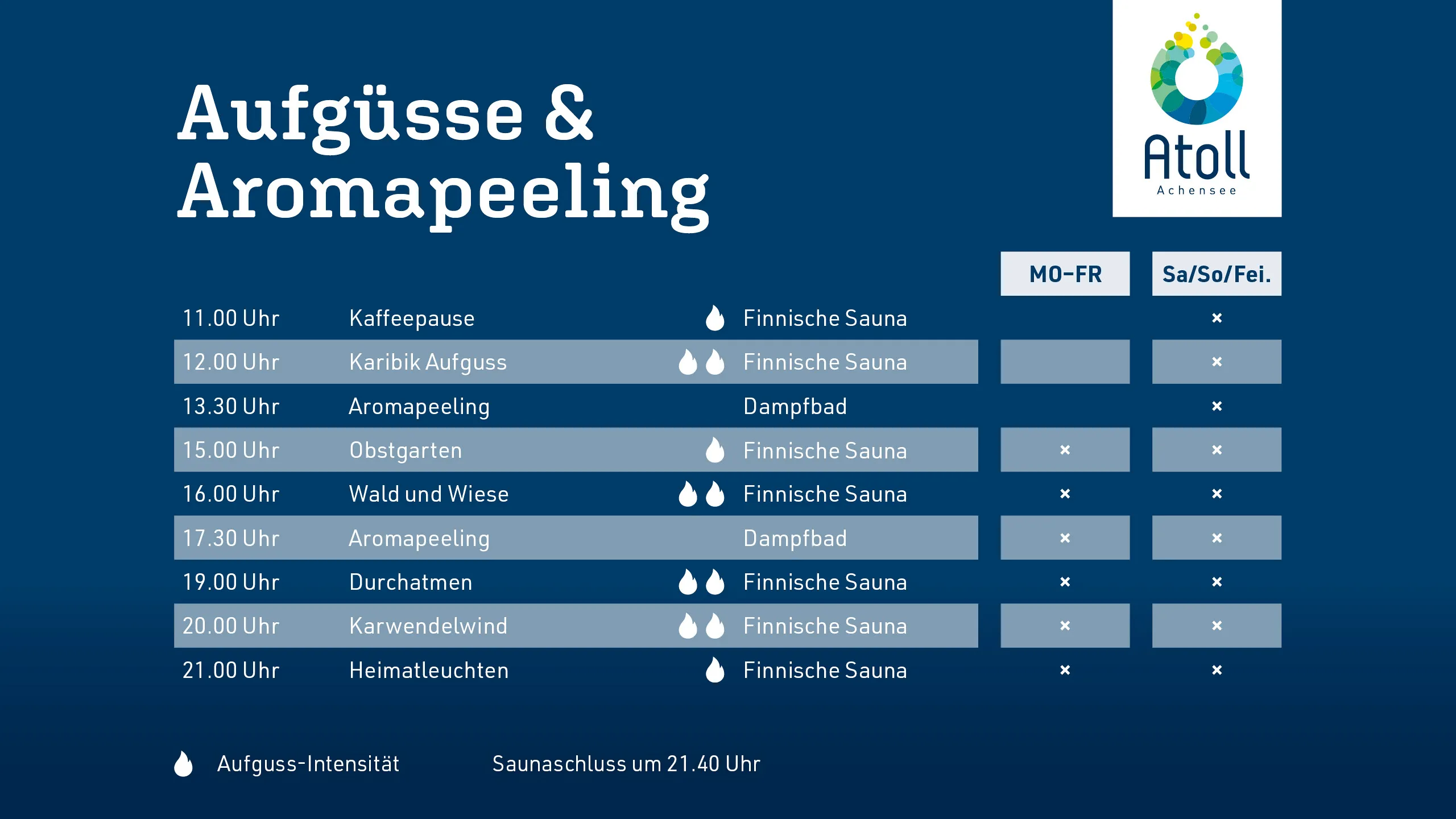 Als zertifizierter Sauna-Premium-Betrieb steht das Atoll Achensee für ausgezeichneten Saunagenuss. Wir arbeiten nur mit Produkten, die höchste Qualitätskriterien erfüllen. Verschiedenste 100 % naturreine ätherische Öle und verführerische Düfte für das Dampfbad begleiten unsere Zeremonien im Penthouse-SPA.